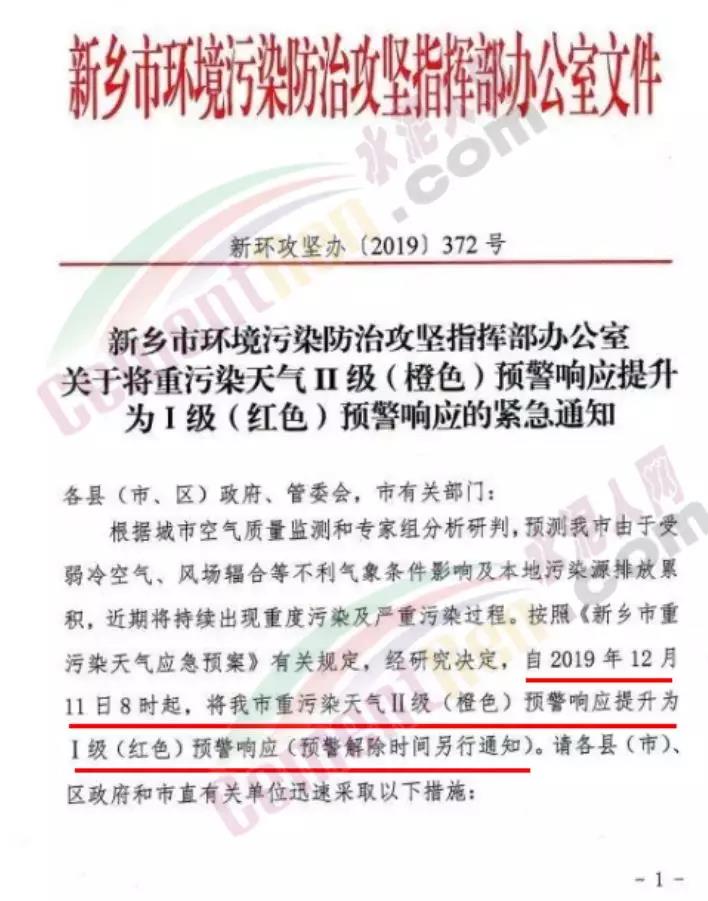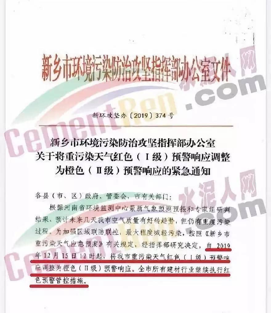 日前,新鄉市環境防治攻堅指揮部辦公室又發一文稱,自12月15日12時起,將新鄉市重污染天氣紅色預警(I級)降至橙色預警(II級),但是全市所有建材行業企業仍舊繼續執行紅色預警管控措施。