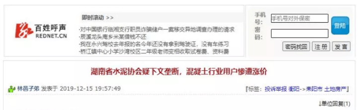 日前,湖南省地方新聞網(wǎng)站紅網(wǎng)《百姓呼聲》欄目刊載耒陽市八家商品混凝土公司的聯(lián)名投訴水泥廠連續(xù)四個(gè)月對(duì)水泥漲價(jià)110元/噸。從七月份起的350元/噸漲到460元/噸。與相鄰區(qū)域差價(jià)85元/噸。市場(chǎng)監(jiān)督管理局將介入調(diào)查。