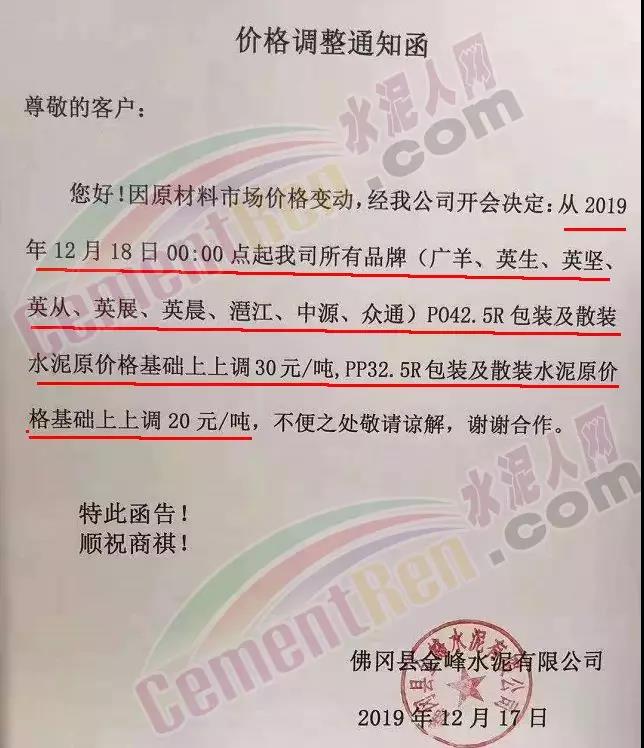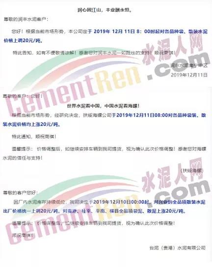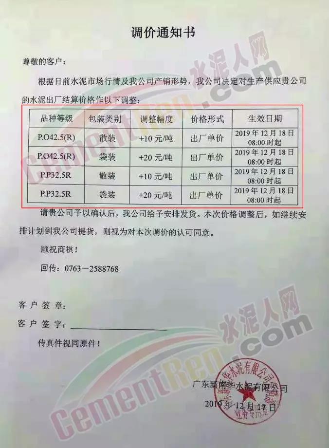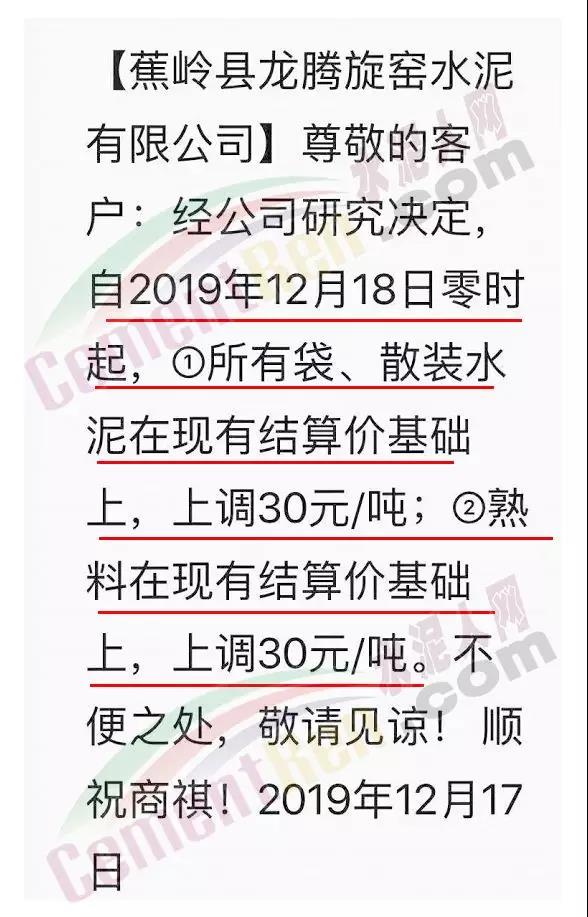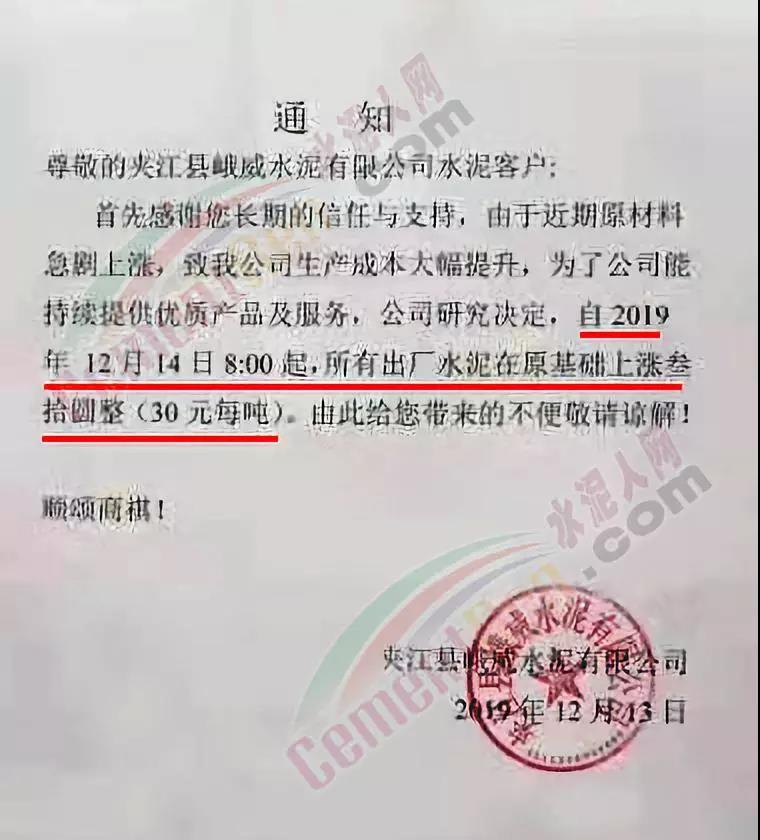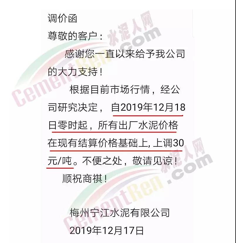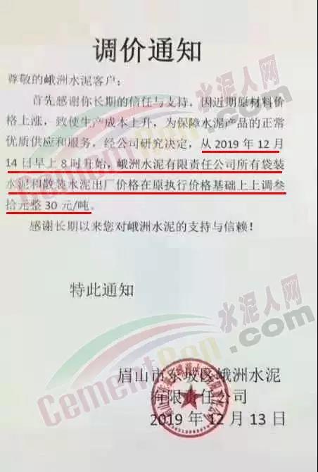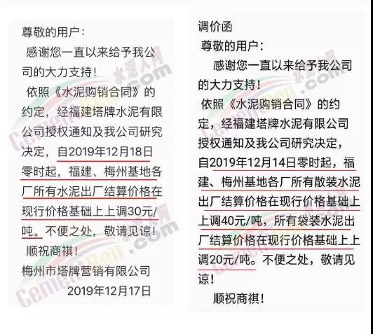 期中,梅州市塔牌營銷通知稱依照《水泥購銷合同》的約定,經(jīng)福建塔牌水泥有限公司授權(quán)通知及我公司研究決定,自2019年12月18日零時(shí)起,福建、梅州基地各廠所有水泥出廠結(jié)算價(jià)格在現(xiàn)行價(jià)格基礎(chǔ)上上調(diào)30元/噸。上周六(14日),這家企業(yè)剛剛通知福建、梅州各基地各廠所有散裝水泥出廠結(jié)算價(jià)格在現(xiàn)行價(jià)格基礎(chǔ)上上調(diào)40元/噸,所有袋裝水泥出廠結(jié)算價(jià)格在現(xiàn)行價(jià)格基礎(chǔ)上上調(diào)20元/噸。