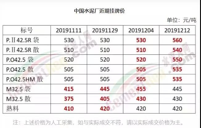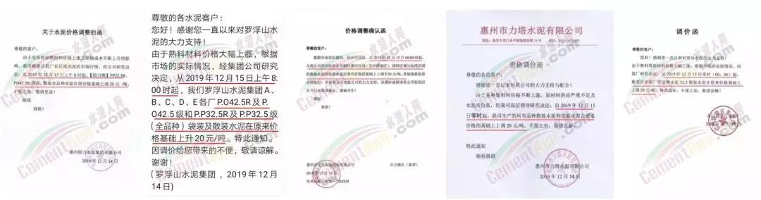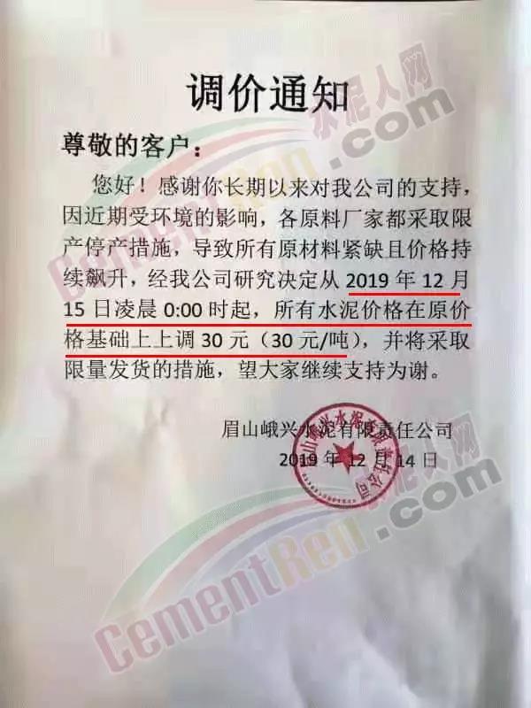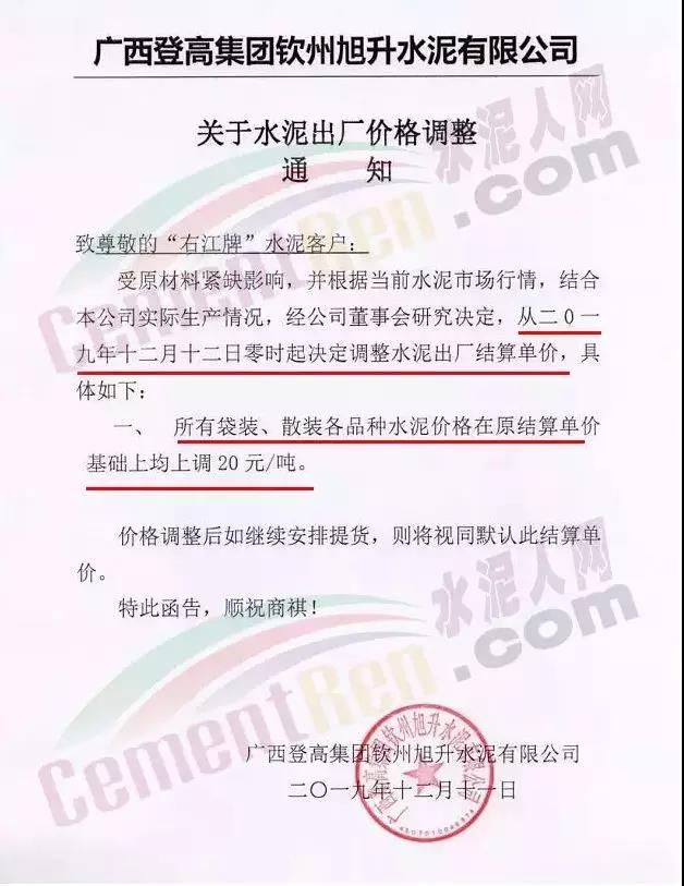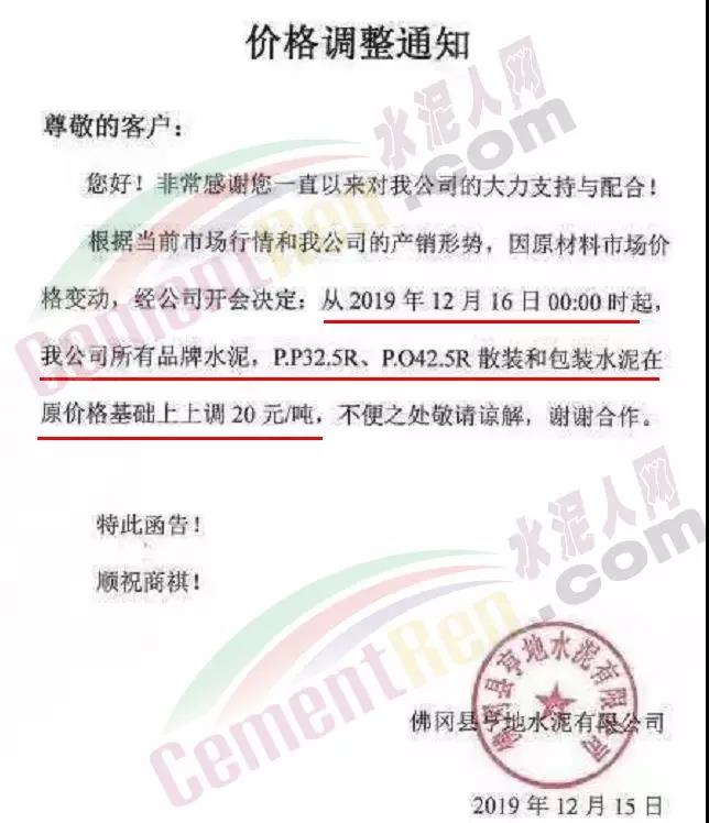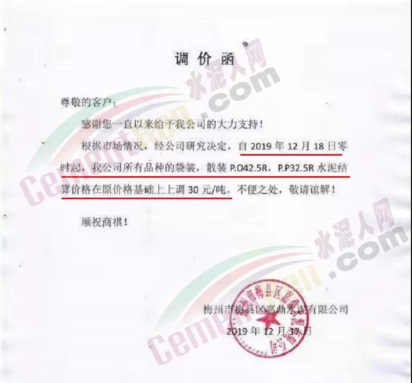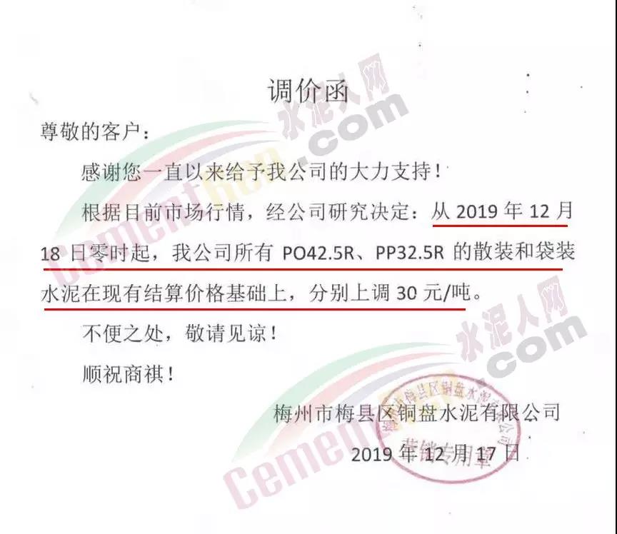 期中,梅州市塔牌營銷通知稱依照《水泥購銷合同》的約定,經(jīng)福建塔牌水泥有限公司授權(quán)通知及我公司研究決定,自2019年12月18日零時(shí)起,福建、梅州基地各廠所有水泥出廠結(jié)算價(jià)格在現(xiàn)行價(jià)格基礎(chǔ)上上調(diào)30元/噸。上周六(14日),這家企業(yè)剛剛通知福建、梅州各基地各廠所有散裝水泥出廠結(jié)算價(jià)格在現(xiàn)行價(jià)格基礎(chǔ)上上調(diào)40元/噸,所有袋裝水泥出廠結(jié)算價(jià)格在現(xiàn)行價(jià)格基礎(chǔ)上上調(diào)20元/噸。
