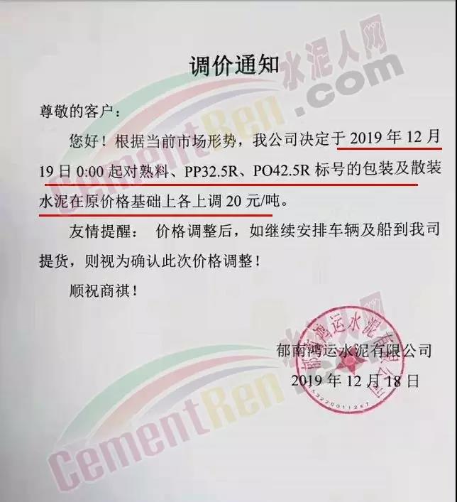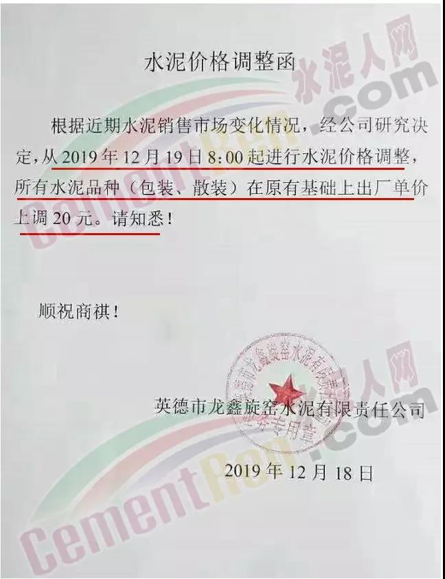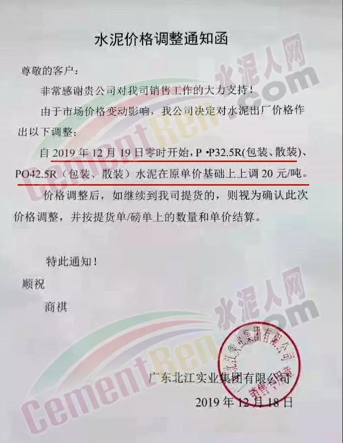 佛山市三水區三鹿水泥調價通知稱自今日(19日)零時起各標號水泥出廠價上調20元/噸。