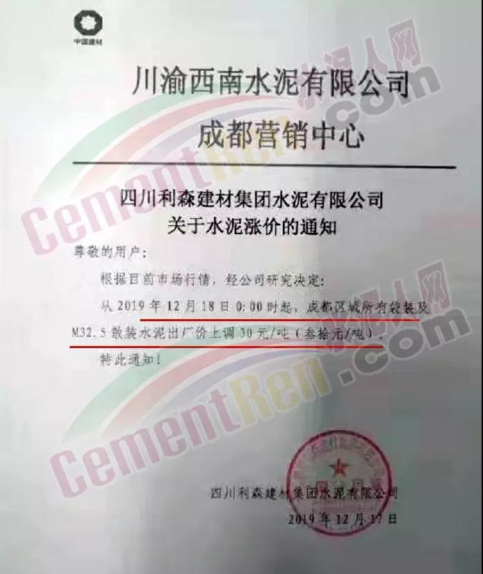 四川利森建材集團漲價通知稱,自12月18日零時起,成都區域所有袋裝及M32.5散裝水泥出廠價上調30元/噸。