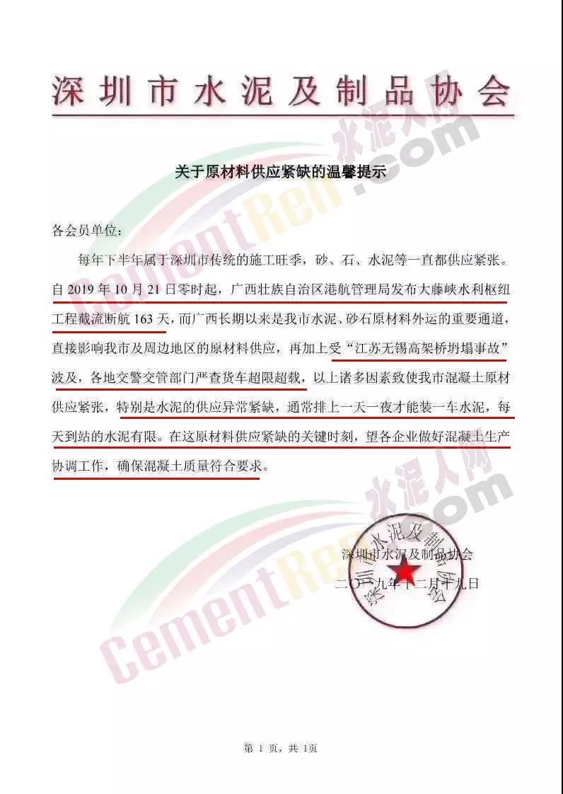 12月19日,深圳市水泥及制品協會緊急發文預警,《關于原材料供應緊缺的提示》,自2019年10月21日零時起,廣西壯族自治區港航管理局發布大藤峽水利樞紐工程截留斷航163天,而廣西長期以來是水泥、砂石原材料外運的重要通道,直接影響廣西及周邊地區的原材料供應,再加上受“江蘇無錫高架橋坍塌事故”涉及,各地交警交管部門嚴查貨車超限超載,以上諸多因素致使廣西混凝土原材料供應緊張,特別是水泥的供應異常緊缺,通常排上一天一夜才能裝一車水泥,每天到站的水泥有限,在這原材料供應緊缺的關鍵時刻,望各企業做好混凝土生產協調工作,確保混凝土質量符合要求。
