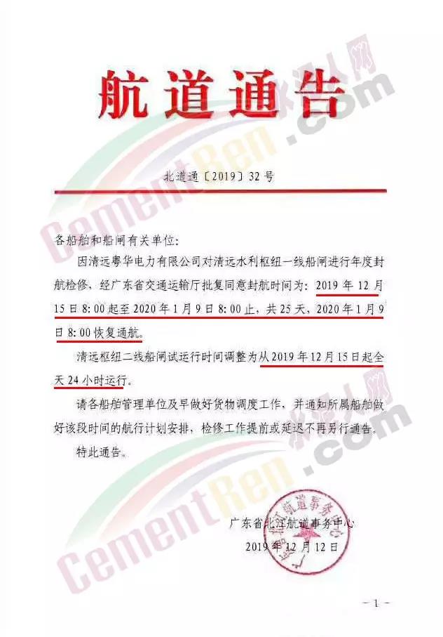 在這之前廣東省北江航道事務中心也發布第32號航道通告稱,因清遠粵華電力有限公司對清遠水利樞紐一線船閘進行年度封航檢修,經廣東省交通運輸廳批復同意封航時間為2019年12月15日8時起至2020年1月9日8時止,共25天,1月9日8時恢復通航。