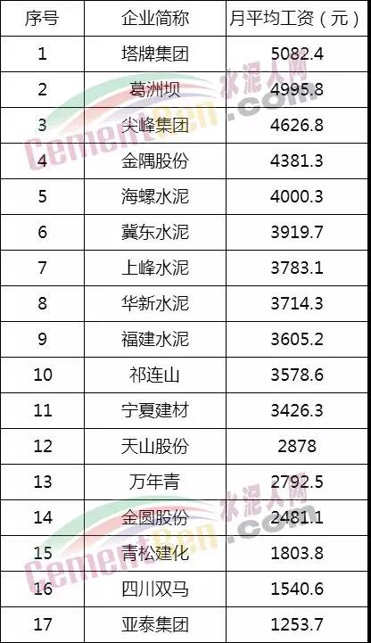 水泥企業(yè)員工月平均工資排行榜