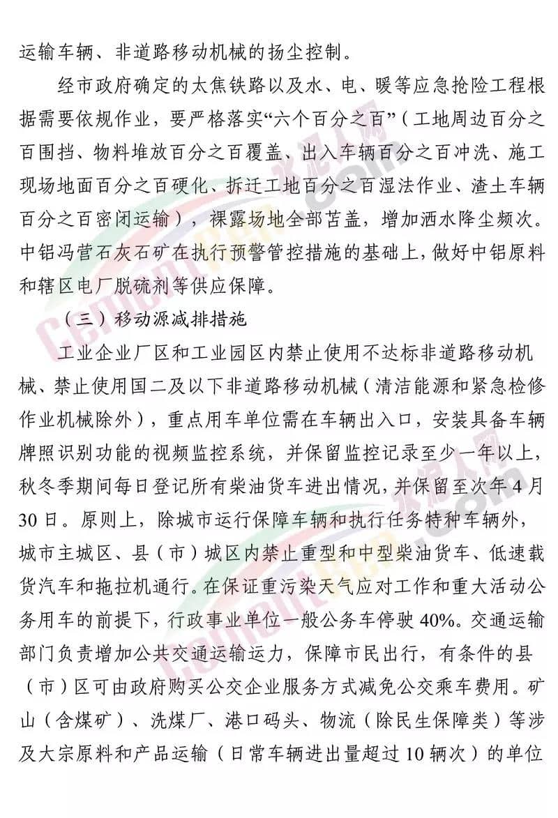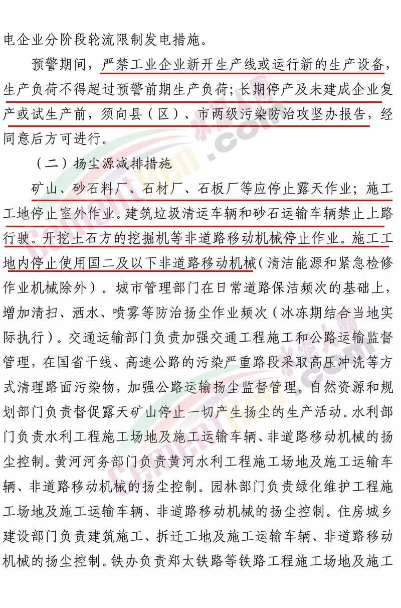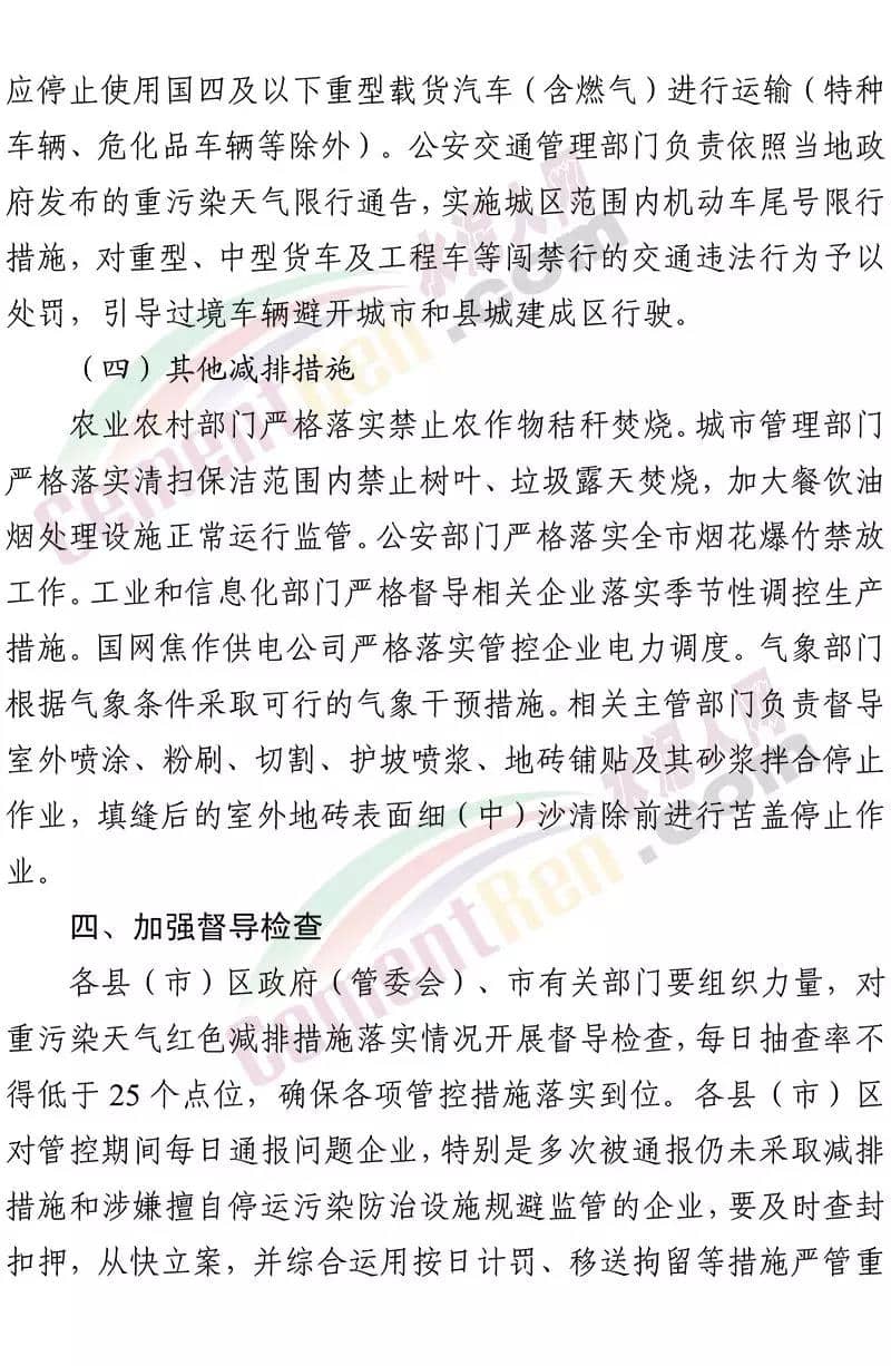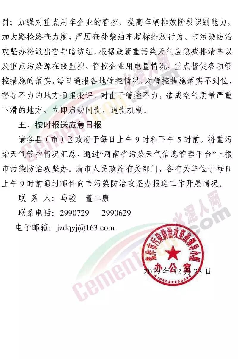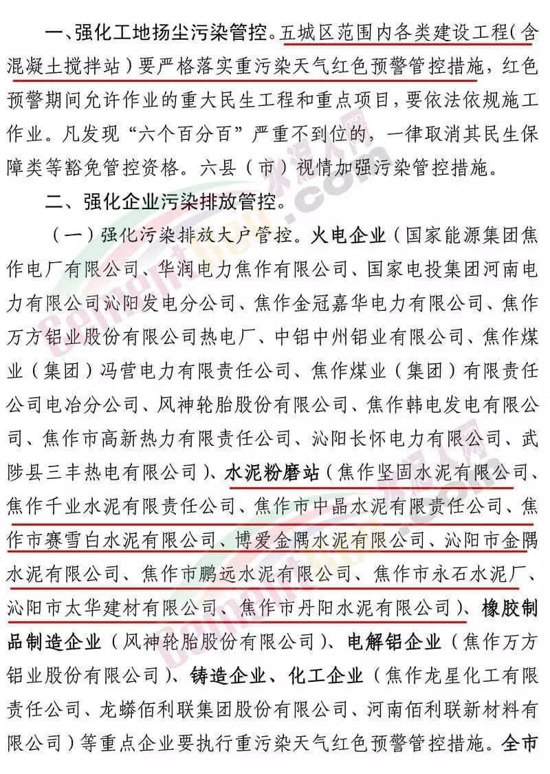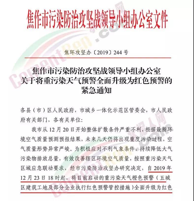 據(jù)了解,12 月 19 日焦作市污染防治攻堅(jiān)戰(zhàn)領(lǐng)導(dǎo)小組辦公室 曾發(fā)布《關(guān)于加強(qiáng) 12 月 20 日至 25 日重污染天氣預(yù)警 應(yīng)急應(yīng)對(duì)工作的緊急通知》要求在全市執(zhí)行重污染天氣橙色預(yù)警管控措施的 基礎(chǔ)上,自 2019 年 12 月 20 日 14 時(shí)至 2019 年 12 月 25 日 24 時(shí), 采取以下強(qiáng)化管控措施強(qiáng)化工地?fù)P塵污染管控。五城區(qū)范圍內(nèi)各類建設(shè)工程(含混凝土攪拌站)要嚴(yán)格落實(shí)重污染天氣紅色預(yù)警管控措施,紅色預(yù)警期間允許作業(yè)的重大民生工程和重點(diǎn)項(xiàng)目,要依法依規(guī)施工作業(yè)。強(qiáng)化污染排放大戶管控。水泥粉磨站(焦作堅(jiān)固水泥有限公司、 焦作千業(yè)水泥有限責(zé)任公司、焦作市中晶水泥有限責(zé)任公司、焦作市賽雪白水泥有限公司、博愛金隅水泥有限公司、沁陽市金隅水泥有限公司、焦作市鵬遠(yuǎn)水泥有限公司、焦作市永石水泥廠、 沁陽市太華建材有限公司、焦作市丹陽水泥有限公司)。全市所有礦山企業(yè)停止作業(yè)。強(qiáng)化運(yùn)輸大戶污染管控。全市煤炭、鋼鐵、電解鋁、 電力、建材、水泥、碳素、化工、礦山等大型工礦企業(yè)原則上停止公路貨運(yùn)車輛運(yùn)輸(涉及生產(chǎn)安全、污染防治設(shè)施穩(wěn)定運(yùn)行等 保障車輛除外),要加強(qiáng)無組織排放管控,有鐵路專用線的要提高鐵路運(yùn)輸運(yùn)力。對(duì)其他工業(yè)企業(yè),各縣(市)區(qū)視情加強(qiáng)污染 管控措施。通知原文如下: