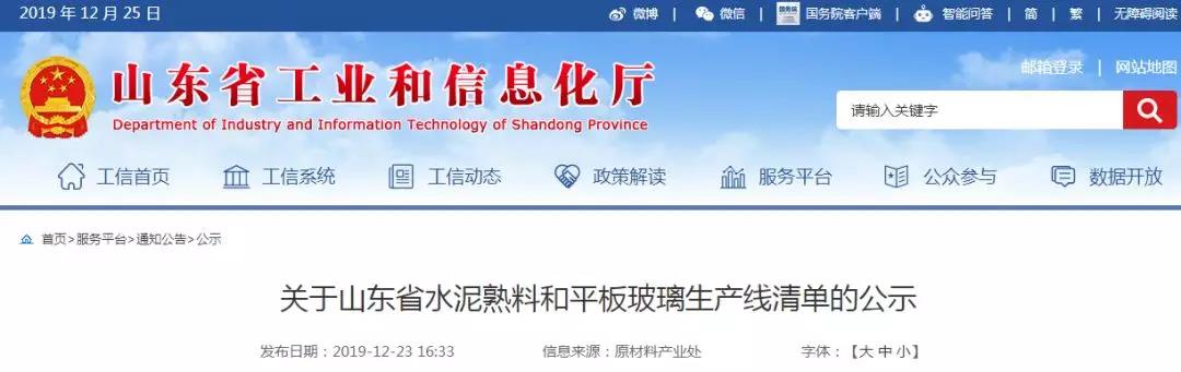 根據工業和信息化部辦公廳和國家發展改革委辦公廳《關于嚴肅產能置換水泥平板玻璃行業新增產能的通知》(工信廳聯原〔2018〕57號)及工信部《關于更新并公開水泥平板玻璃生產線清單的函》(工原函〔2019〕527號)有關要求,經匯總并組織專家審核各市工業和信息化主管部門報送的水泥熟料和平板玻璃生產線清單和相關資料,結合2018年公告的水泥玻璃產能情況,形成更新后的全省水泥熟料和平板玻璃生產線清單。現將截止2018年12月31日的山東省水泥熟料和平板玻璃生產線清單予以公示,公示期時間自2019年12月23日至12月28日。如有異議,請在公示時間內向山東省工信廳反映。