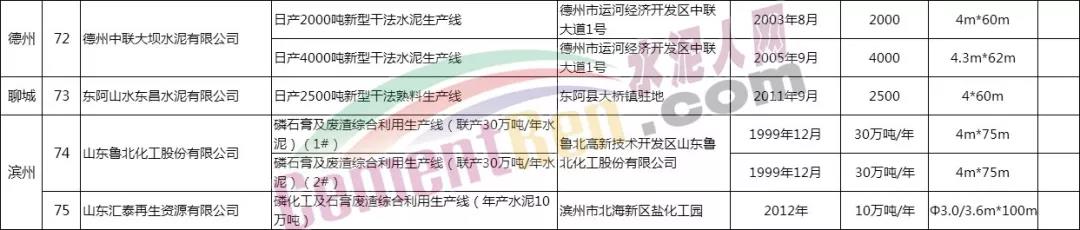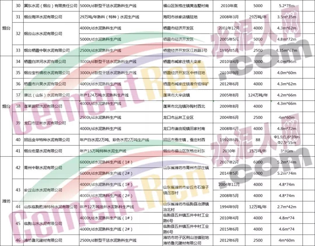 山東省水泥熟料生產線清單如下: