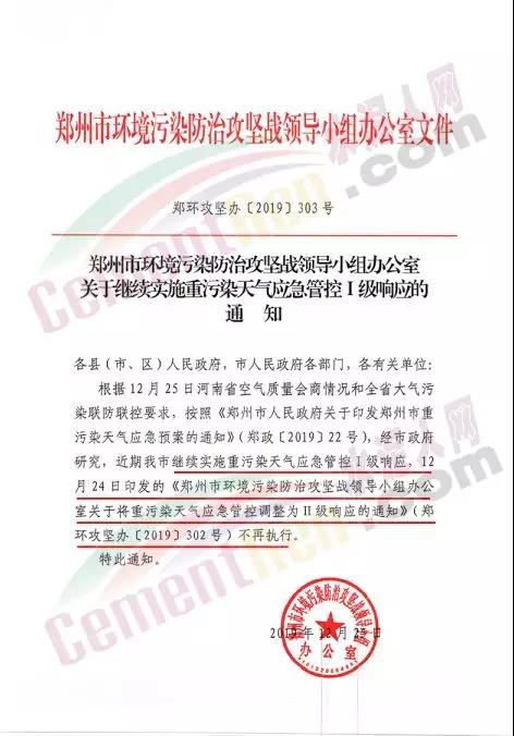日前,鄭州市環(huán)境污染防治攻堅戰(zhàn)領導小組辦公室發(fā)布《關于繼續(xù)實施重污染天氣應急管控I級響應的通知》稱,根據12月25日河南省空氣質量會商情況和全省大氣污染聯防聯控要求,按照《鄭州市人民政府關于印發(fā)鄭州市重污染天氣應急預案的通知》(鄭政【2019】22號),經鄭州市政府研究,近期鄭州市繼續(xù)實施重污染天氣應急管控I級響應,12月24日印發(fā)的《鄭州市環(huán)境污染防治攻堅戰(zhàn)領導小組辦公室關于將重污染天氣應急管控調整為II級響應的通知》(鄭環(huán)攻堅辦【2019】302號)不再執(zhí)行。