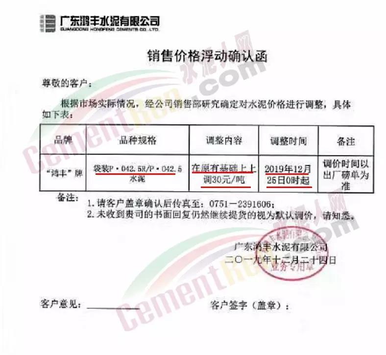 日前,廣東匯豐水泥有限公司通知水泥銷售價格浮動,“鴻豐”牌袋裝PO42.5/PO42.5水泥自12月25日0時起在原價基礎上上調30元/噸,調價時間以出廠磅單為準。
