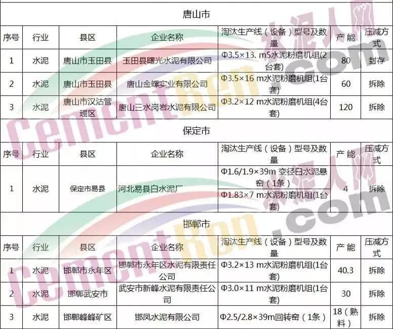 從上表可見(jiàn)河北省唐山市3家水泥企業(yè)、保定市1家水泥企業(yè)、邯鄲市3家水泥企業(yè)、2臺(tái)套水泥粉磨機(jī)組被封存8臺(tái)套水泥粉磨機(jī)組被拆除,2臺(tái)懸窯回轉(zhuǎn)窯被拆除,淘汰產(chǎn)能合計(jì)352.3萬(wàn)噸。