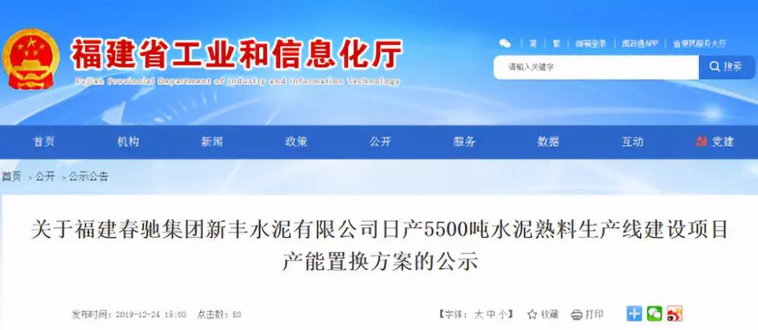 12月24日,福建省工業(yè)信息化廳發(fā)布了《關(guān)于福建春馳集團(tuán)新豐水泥有限公司日產(chǎn)5500噸水泥熟料生產(chǎn)線建設(shè)項(xiàng)目產(chǎn)能置換方案的公示》,原文如下: