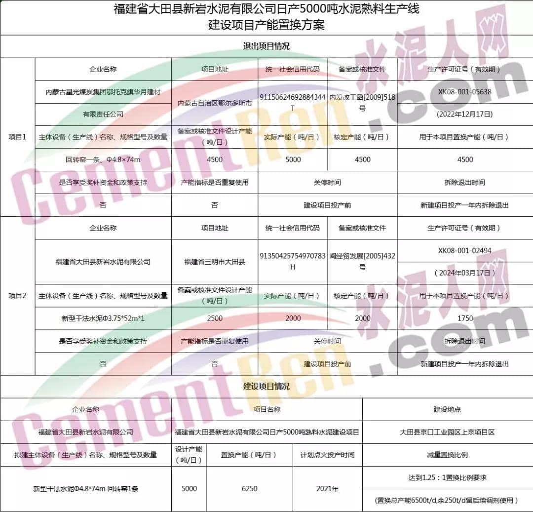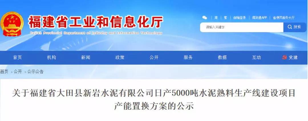 同期,福建省工業(yè)和信息化廳發(fā)布了《關(guān)于福建省大田縣新巖水泥有限公司日產(chǎn)5000噸水泥熟料生產(chǎn)線建設(shè)項(xiàng)目產(chǎn)能置換的公示》,原文如下: