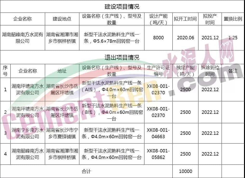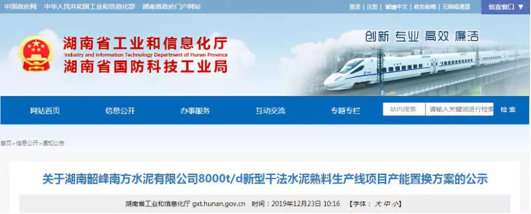 12月23日,湖南省工業(yè)和信息化廳發(fā)布了《關(guān)于湖南韶峰南方水泥有限公司8000t/d新型干法水泥熟料生產(chǎn)線項(xiàng)目產(chǎn)能置換方案的公示》,原文如下: