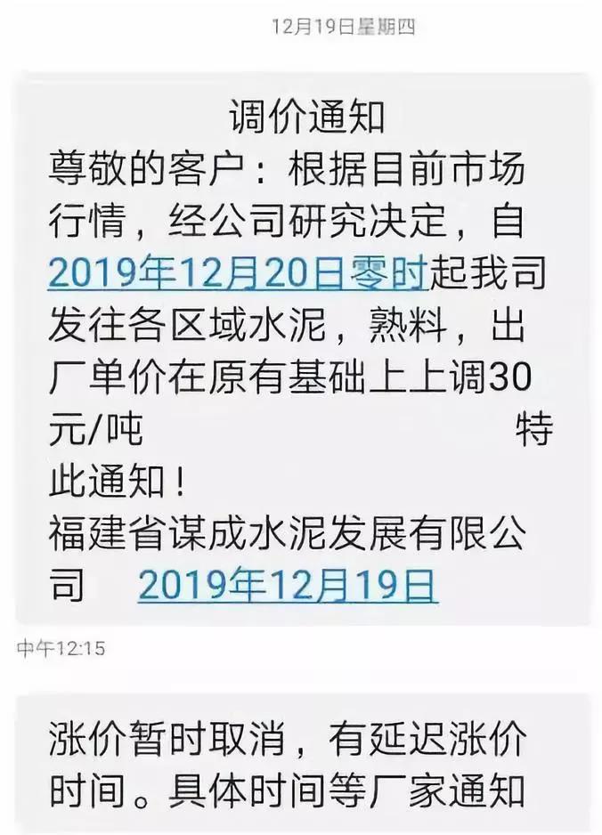12月19日,福建謀成水泥發展有限公司通知,根據市場情況,經公司研究決定自20日零時起發區域的水泥及熟料出廠價上調30元/噸,同日午間,又發通知稱漲價暫時延期。