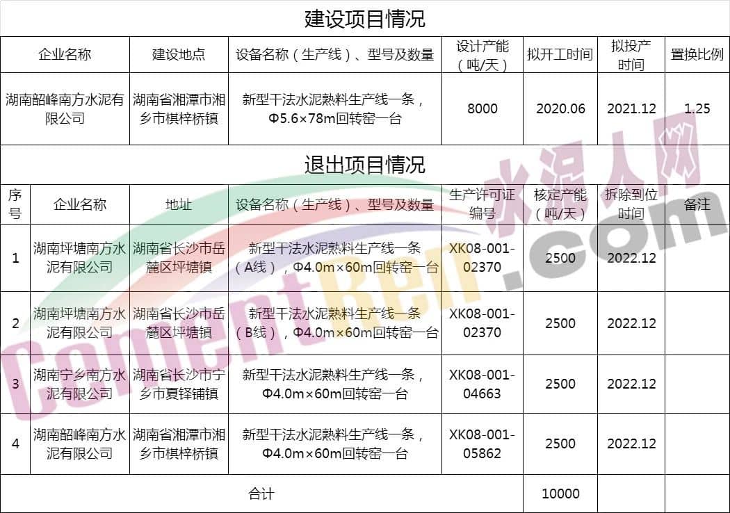 昨日(12月31日),湖南省工業和信息化廳發布了《關于湖南韶峰南方水泥有限公司8000t/d新型干法水泥熟料生產線項目產能置換方案的公告》,原文如下: 產能置換方案如下: 上述方案顯示,湖南韶峰南方水泥有限公司將在湖南省湘潭市湘鄉市棋梓橋鎮擬建一條日產8000噸熟料生產線(Φ5.6×78m回轉窯),擬2020年6月開工,2021年12月投產。