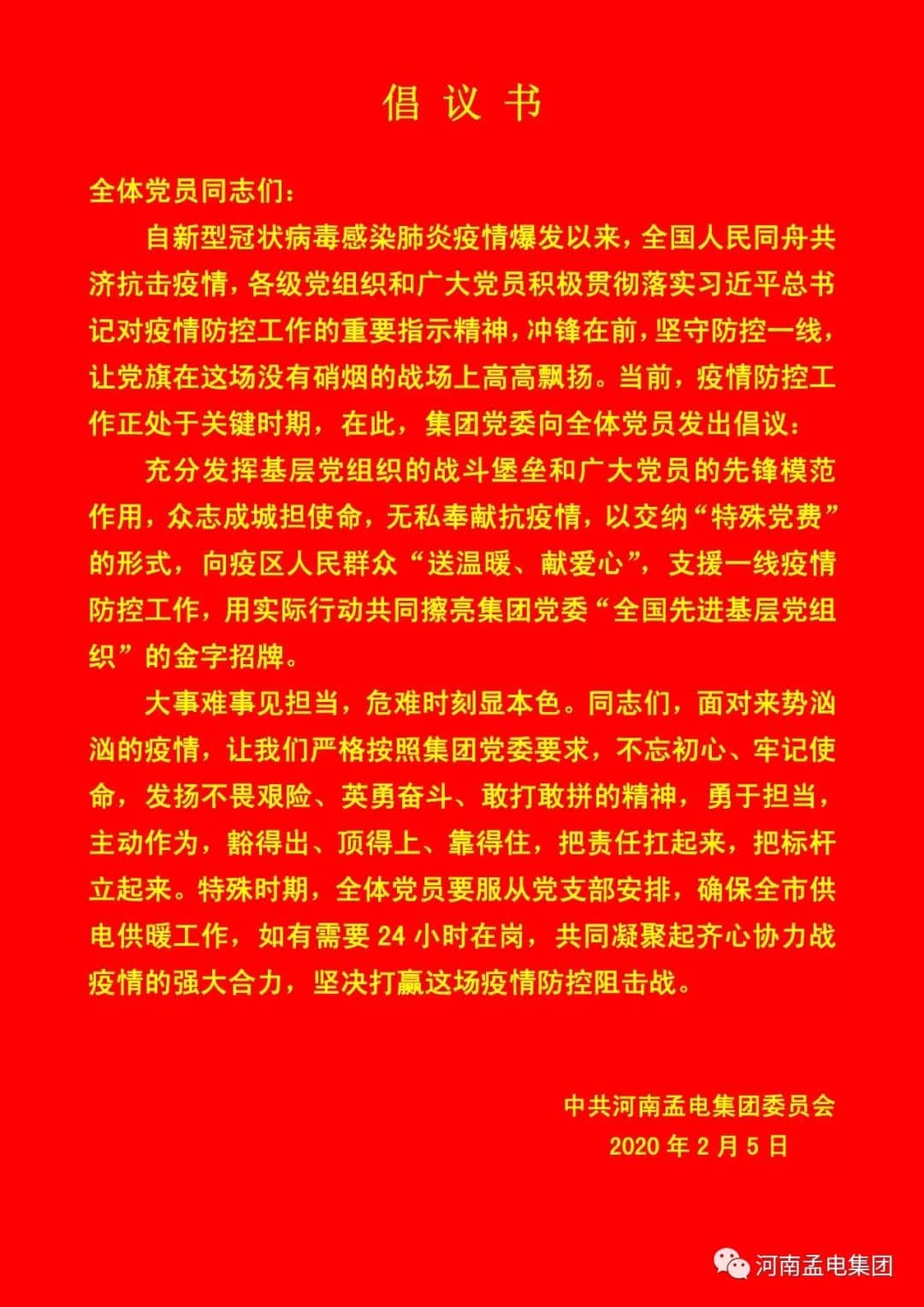 2月5日一早,集團黨委向全體黨員發出了“同舟共濟獻愛心,眾志成城抗疫情”倡議書,號召黨員以交納黨費的形式,支援全市一線疫情防控工作。大事難事見擔當,危難時刻顯本色,短短兩個小時時間,集團208名黨員迅速行動,主動交納黨費達20萬元,用實際行動體現了共產黨員的責任和擔當。