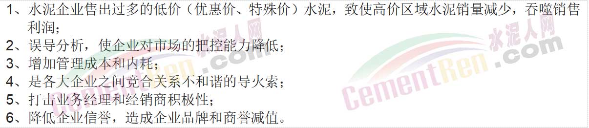 據多位水泥企業集團銷售總監反饋,近年來,由于行業對錯峰生產和重污染天氣預警疊加執行停窯,南北方等各區域水泥價格差異較大,跨區域銷售及“竄貨”銷售嚴重擾亂正常的市場秩序,頑疾難除,苦不堪言。筆者總結“竄貨”的禍害主要有:
