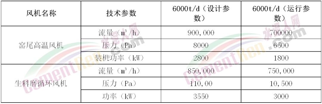 而風(fēng)機(jī)設(shè)計參數(shù)余量系數(shù)過大,則實際運(yùn)行參數(shù)遠(yuǎn)低于設(shè)計參數(shù)。下表為6000t/d產(chǎn)量規(guī)模的水泥熟料生產(chǎn)線(窯尾高溫風(fēng)機(jī)以及生料磨循環(huán)風(fēng)機(jī))原始設(shè)計參數(shù)與實際運(yùn)行參數(shù)對比: