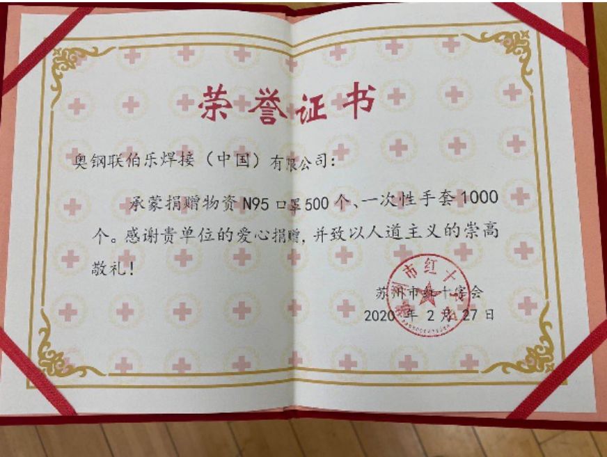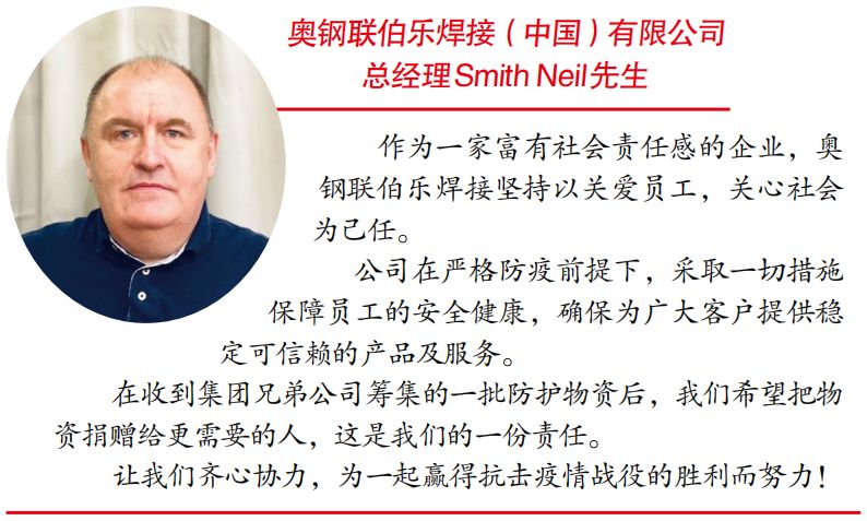 奧鋼聯伯樂焊接(中國)有限公司總經理 Neil Smith先生說:作為一家富有社會責任感的企業,奧鋼聯伯樂焊接堅持以關愛員工,關心社會為己任。 公司在嚴格防疫前提下,采取一切措施保障員工的安全健康,確保為廣大客戶提供穩定可信賴的產品及服務。在收到集團兄弟公司籌集的一批防護物資后,我們希望把物資捐贈給更需要的人,這是我們的一份責任。