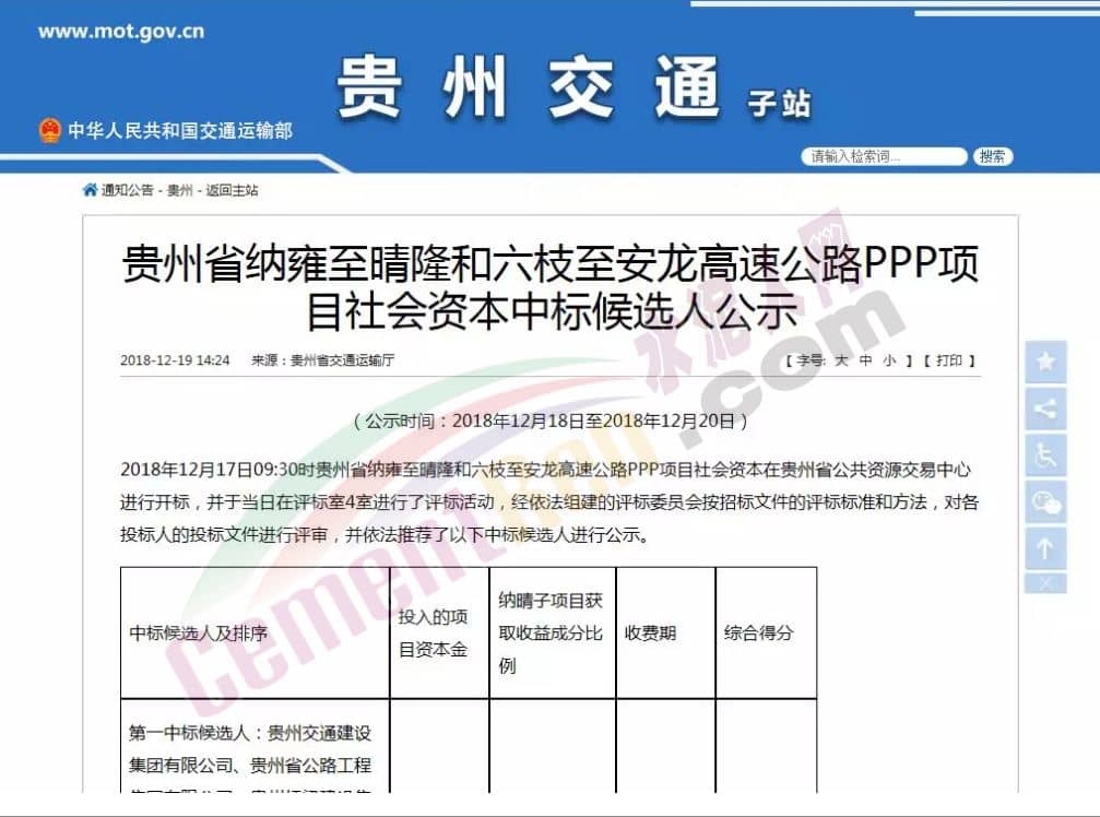 2018年12月19日,總投資達596億元的貴州省納雍至晴隆和六枝至安龍高速公路PPP項目社會資本項目納晴子項目和六安子項目在貴州交通廳網站發布了中標結果。
