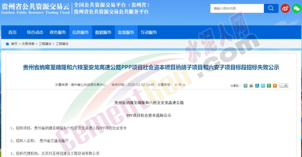 3月2日:貴州省公共資源交易中心發布《貴州省納雍至晴隆和六枝至安龍高速公路PPP項目社會資本項目納晴子項目和六安子項目標段招標失敗公示》。