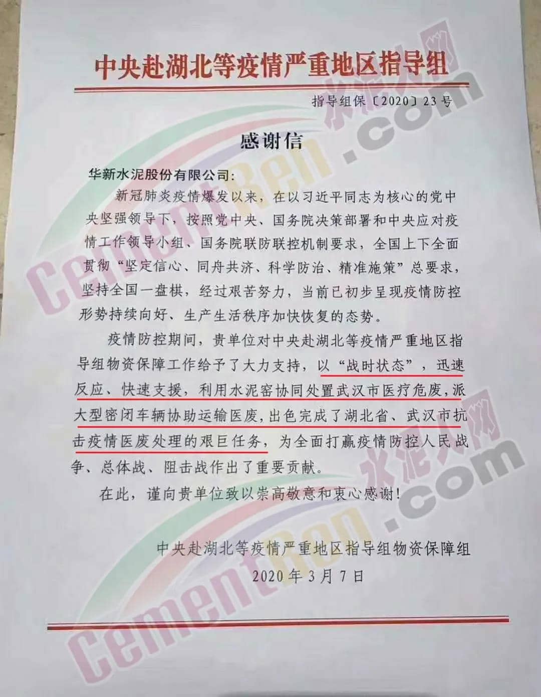 中央指導(dǎo)組在感謝信中寫道,疫情防控期間,華新公司對(duì)中央赴湖北等疫情嚴(yán)重地區(qū)指導(dǎo)組物資保障工作給予了大力支持,并以“戰(zhàn)時(shí)狀態(tài)”,迅速反應(yīng)、快速支援,利用水泥窯協(xié)同處置武漢市醫(yī)療危廢,派大型密閉車輛協(xié)助運(yùn)輸醫(yī)廢,出色完成了湖北省、武漢市抗擊疫情醫(yī)廢處理的艱巨任務(wù),為全面打贏疫情防控人民戰(zhàn)爭(zhēng)、總體戰(zhàn)、阻擊戰(zhàn)作出了重要貢獻(xiàn)。
