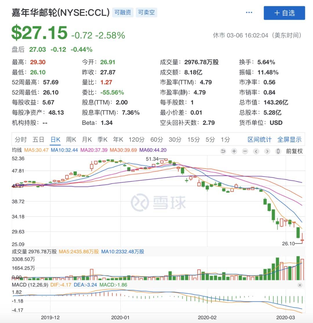 自1月21日至今,嘉年華郵輪股價(jià)近腰斬,累計(jì)蒸發(fā)市值近110億美元,折合人民幣770億元。