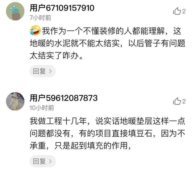 另外的網友卻認為張先生明顯就是訛詐,稱商家在安裝地暖上沒有一點毛病,用砂漿回填是絕對可以的,這樣有助于后期維修, 如果水泥完全凝固的話,對地暖散熱就會存在一定的影響。