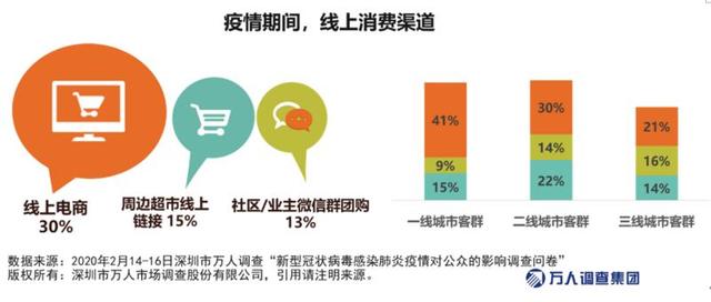 通過調查發現,線上電商在不同年齡層消費者中的影響已經顯現,全民“下單”熱。線上電商(叮咚買菜、每日優鮮、盒馬、美團等)的消費熱度:一線遠遠好于二三線城市。一線城市選擇線上電商消費的比例為41%,二線城市為30%,三線城市為21%。值得一提的是,社區/業主微信群團購業務在三線城市的表現(16.3%)遠好于一二線城市(8.6%),說明社群經濟已在三線城市不斷下沉。