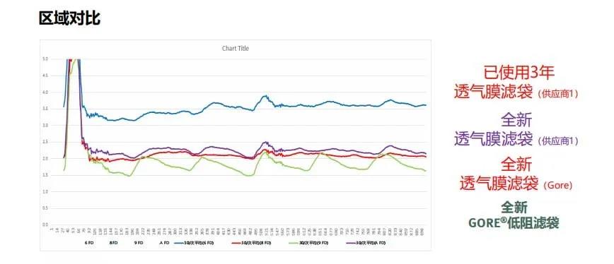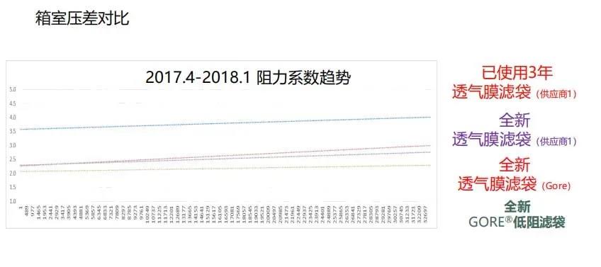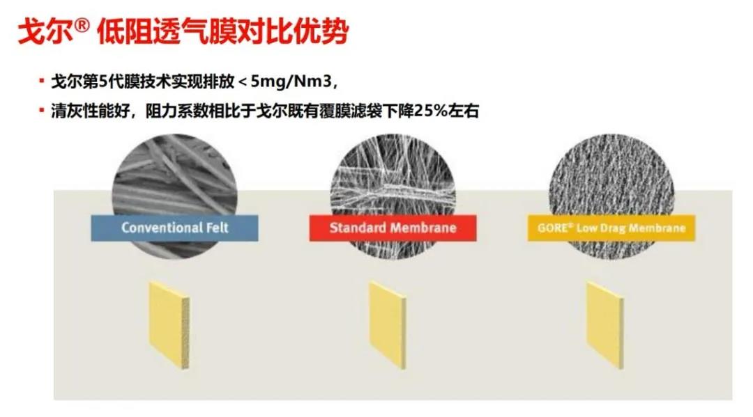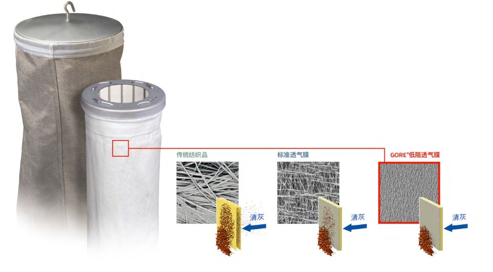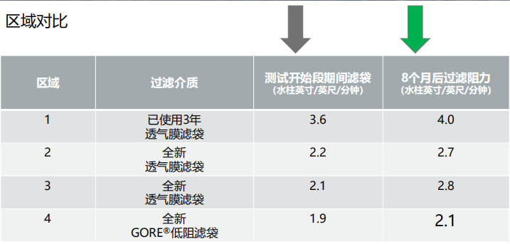 GORE®低阻透氣膜運行阻力系數更低,可以有效提高風量并降低風機能耗。關鍵在于提高了清灰能力,而且不會犧牲使用壽命或顆粒物捕集能力。