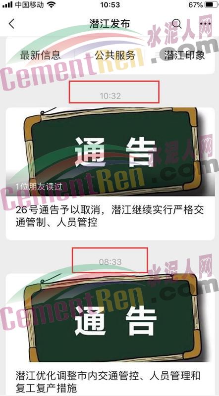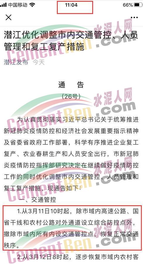 3月11日8時33分時,湖北省潛江市新型冠狀病毒肺炎疫情防控指揮部發布26號通告稱,從3月11日10時起,除市域內高速公路、國省干線和農村公路對外通道設立綜合防控點外,撤除市域內所有內設交通管控點,恢復正常交通秩序;從3月12日8時起,逐步恢復市域內農村客運、公交客運、出租客運以及渡口碼頭(跨市域渡口除外)。具體運行嚴格按照《市交通運輸局關于做好交通運輸企業復工復產工作的通知》執行。