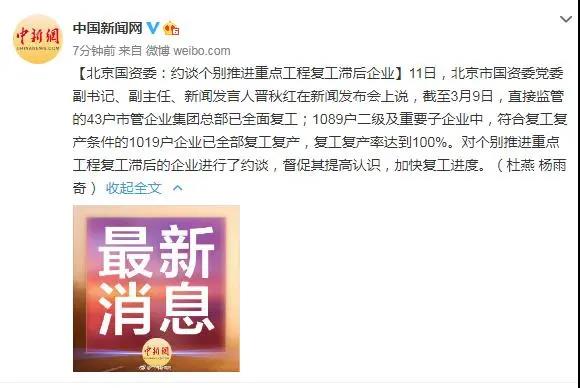3月11日,北京市國(guó)資委黨委副書(shū)記、副主任、新聞發(fā)言人晉秋紅在新聞發(fā)布會(huì)上說(shuō),截至3月9日,直接監(jiān)管的43戶市管企業(yè)集團(tuán)總部已全面復(fù)工;1089戶二級(jí)及重要子企業(yè)中,符合復(fù)工復(fù)產(chǎn)條件的1019戶企業(yè)已全部復(fù)工復(fù)產(chǎn),復(fù)工復(fù)產(chǎn)率達(dá)到100%。對(duì)個(gè)別推進(jìn)重點(diǎn)工程復(fù)工滯后的企業(yè)進(jìn)行了約談,督促其提高認(rèn)識(shí),加快復(fù)工進(jìn)度。