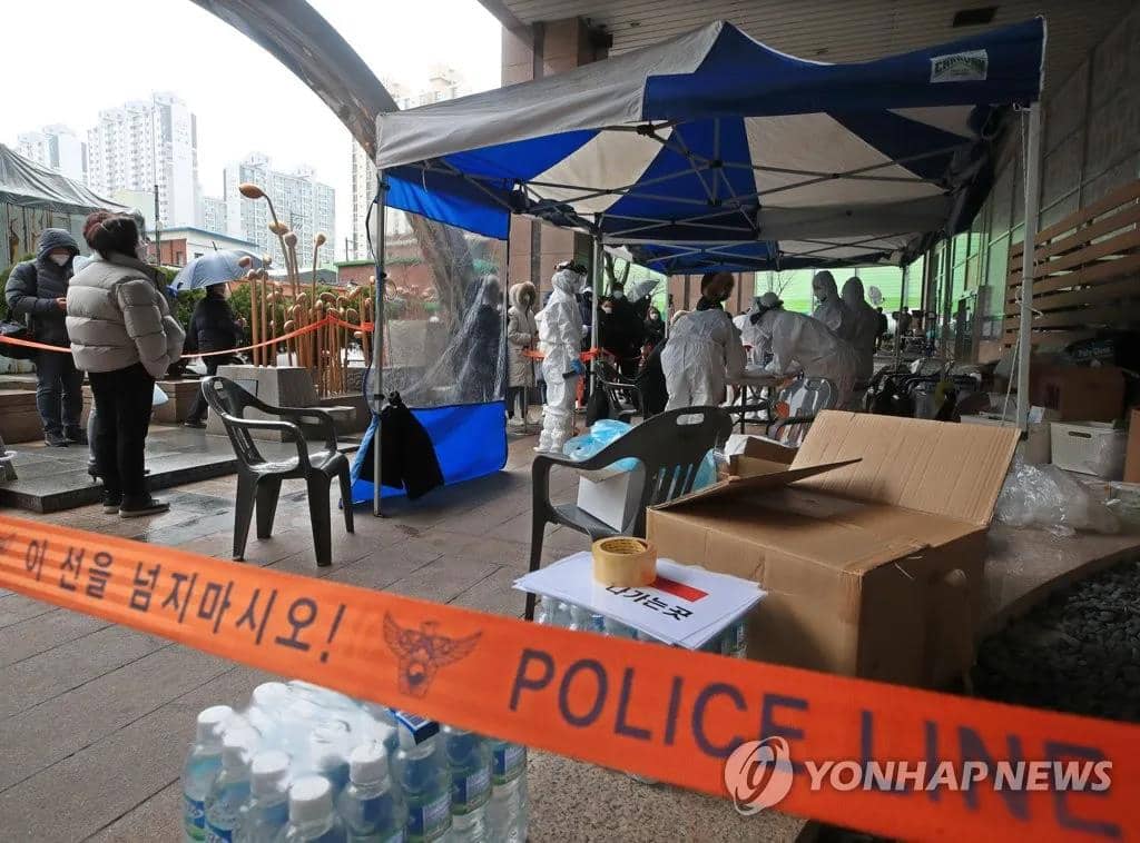 △3月10日上午,在首爾市九老區的一家呼叫中心門口,當地居民進入篩查診所接受診查。圖/韓聯社