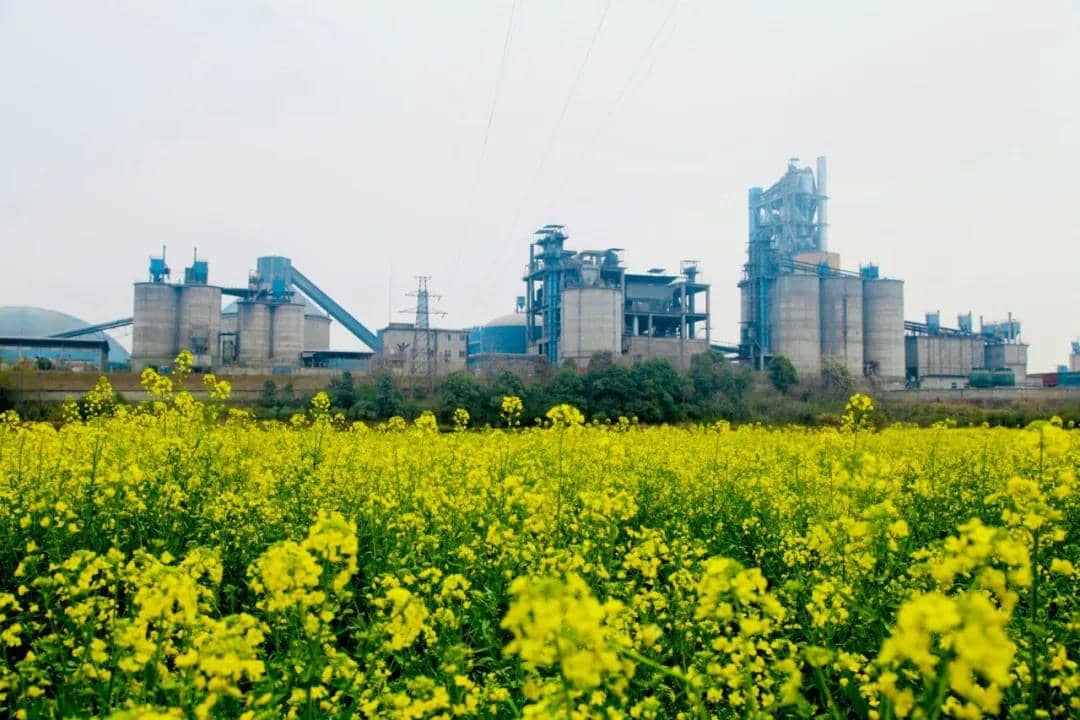 ▲被油菜花田環(huán)繞的中材株洲水泥