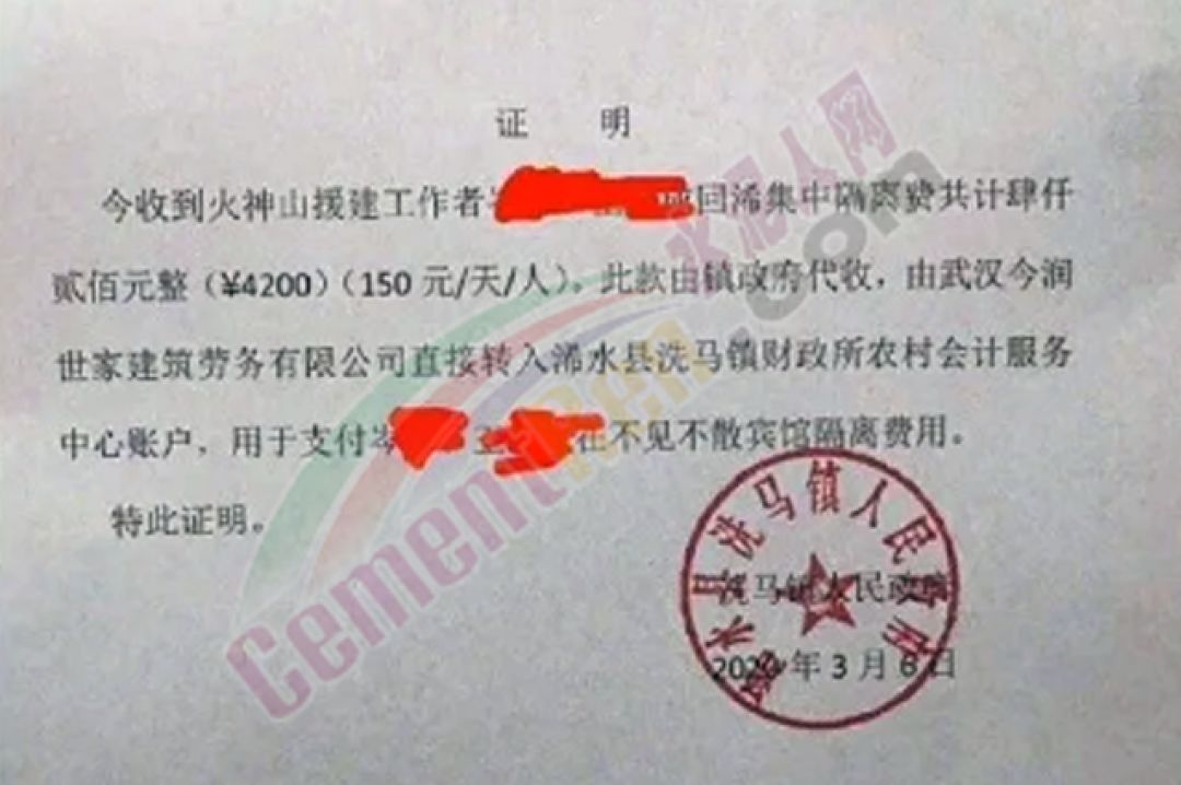 3月8日,兩名參建武漢“火神山”醫院的建設者在返回浠水縣洗馬鎮后,被要求支付集中隔離費4200元(150元/天/人),用于支付某賓館的隔離費用,此消息一出引起了網友的高度關注。