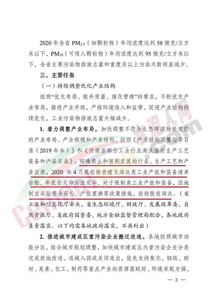 1、2020年4月底前排查建立淘汰類工業(yè)產(chǎn)能和裝備清單臺賬,年底前關停淘汰完畢。對于限制類工業(yè)產(chǎn)能和裝備,因地制宜采取資金獎補、產(chǎn)能置換等政策措施,鼓勵提前淘汰。