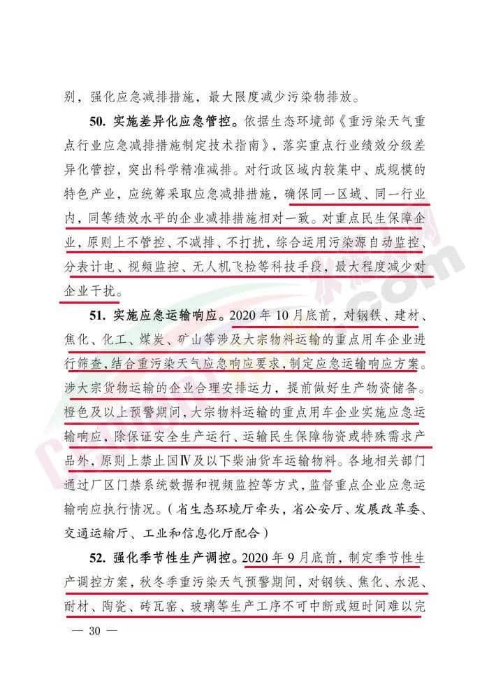 7.2020年9月底前,制定季節(jié)性生產(chǎn)調(diào)控方案,秋冬季重污染天氣預警期間,對水泥等生產(chǎn)工序不可中斷或短時間內(nèi)難以完成停產(chǎn)的,對污染較重、排放較大、區(qū)域產(chǎn)能過剩的行業(yè),結(jié)合生產(chǎn)特點和對空氣質(zhì)量的影響,預先調(diào)整生產(chǎn)計劃,實施秋冬季生產(chǎn)調(diào)控。
