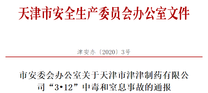 3月17日,天津市安全生產委員會辦公室發布《關于天津市津津制藥有限公司“3•12”中毒和窒息事故的通報》 稱:事故暴露出該企業安全意識淡薄,沒有認真吸取同類事故教訓,進入受限空間作業管理失控等突出問題,以及企業安全管理混亂、地方監管部門受限空間作業安全專項整治不到位、安全監管失之于軟等突出問題。通報原文如下: