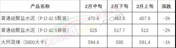 國家統計局流通領域重要生產資料市場價格變動情況顯示自2月中旬開工以來,水泥及煤炭等價格下行。市場主流產品PO.42.5水泥均價跌幅在2%~3%。