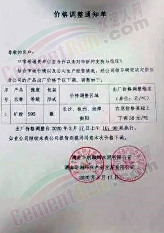 3月7日,浙江寧波主導企業通知,PO42.5散裝、PO42.5袋裝水泥下調30元/噸,M32.5散裝、M32.5袋裝水泥價格下調40元/噸。