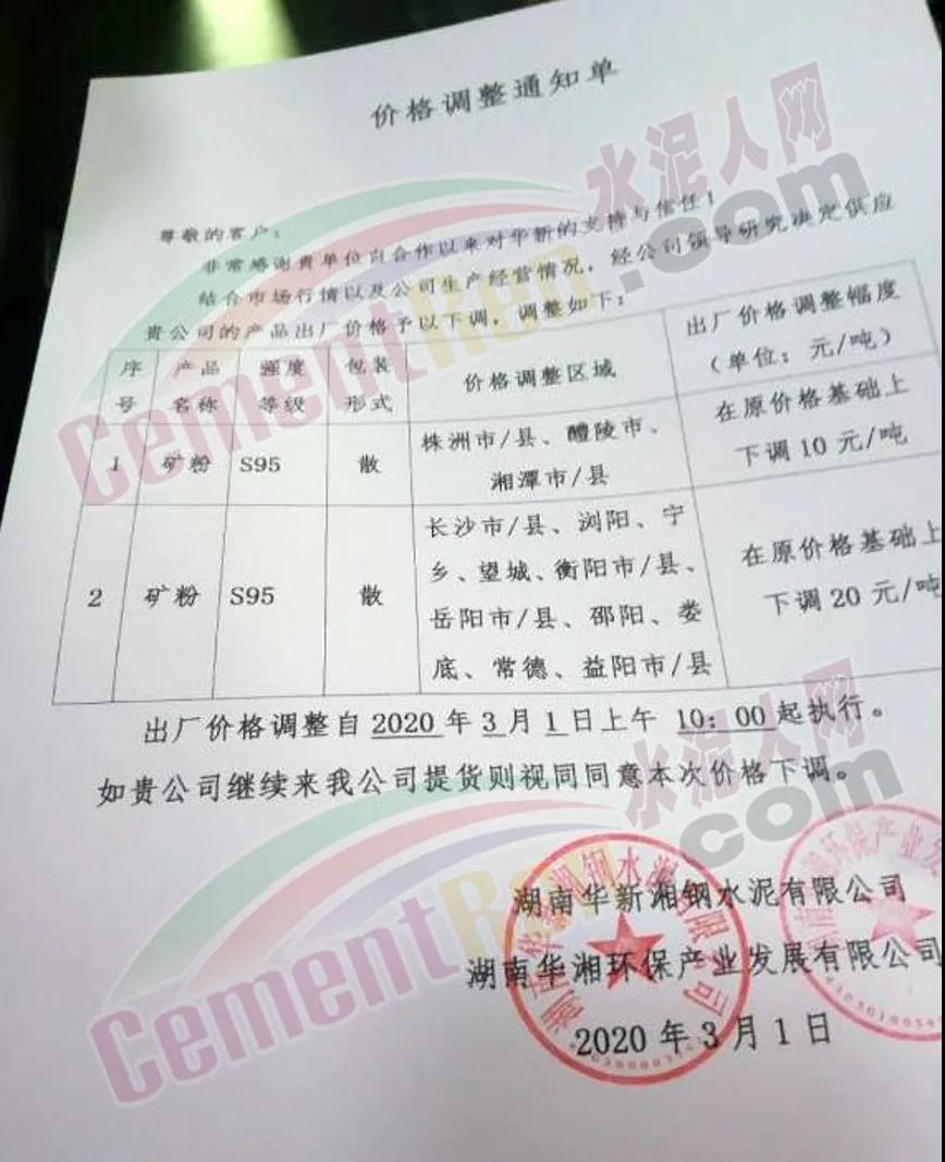 3月9日前后,湖南永州部分主導企業通知下調水泥價格20-30元/噸。