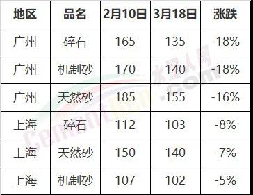 砂石方面,華南區域廣州區域礦石、機制砂、天然砂跌幅達16~18%。上海市砂石價報價較2月中旬跌幅在5%以上。
