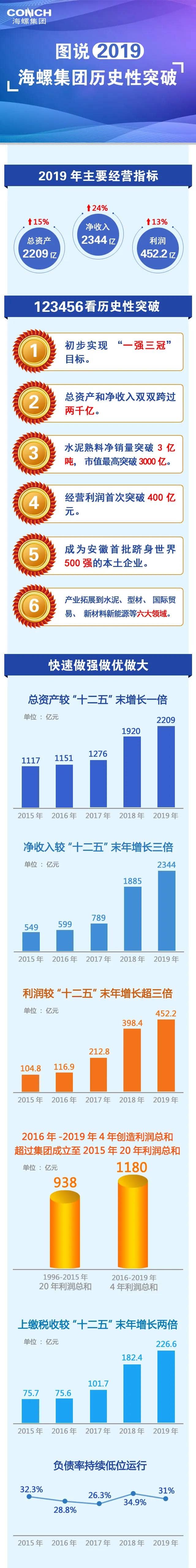 3月20日晚間,海螺水泥發布2019年年度報告,營收利潤均刷新歷史高度。全年實現營業收入1570.3億元,同比增長22.3%;凈利潤335.93億元,同比增長12.67%。據此測算,公司去年平均每天凈賺超9000萬元。