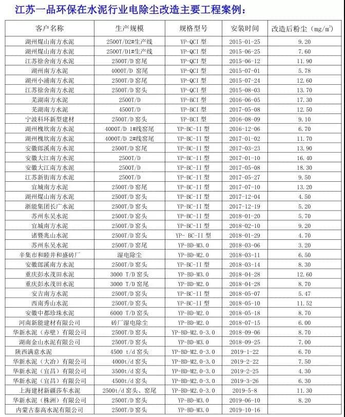 目前,江蘇一品環(huán)保的水泥窯電除塵超低排放改造技術(shù),積累了豐富的改造經(jīng)驗(yàn),已成功為中國建材南方水泥、湖南金山水泥、新疆莎車水泥、內(nèi)蒙古泰高、華新水泥集團(tuán)等100多條水泥生產(chǎn)線進(jìn)行了達(dá)標(biāo)和超低排放改造,眾多的業(yè)績案例,使江蘇一品積累了豐富的改造經(jīng)驗(yàn)和成熟的改造方案!