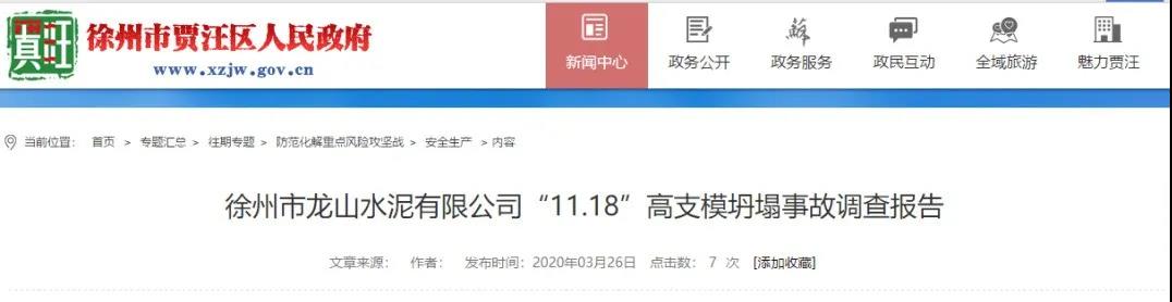 日前,江蘇省徐州市賈汪區人民政府發布了《徐州市龍山水泥有限公司”11.18“高支模坍塌事故》調查結果。其結果發現涉及多項違規。