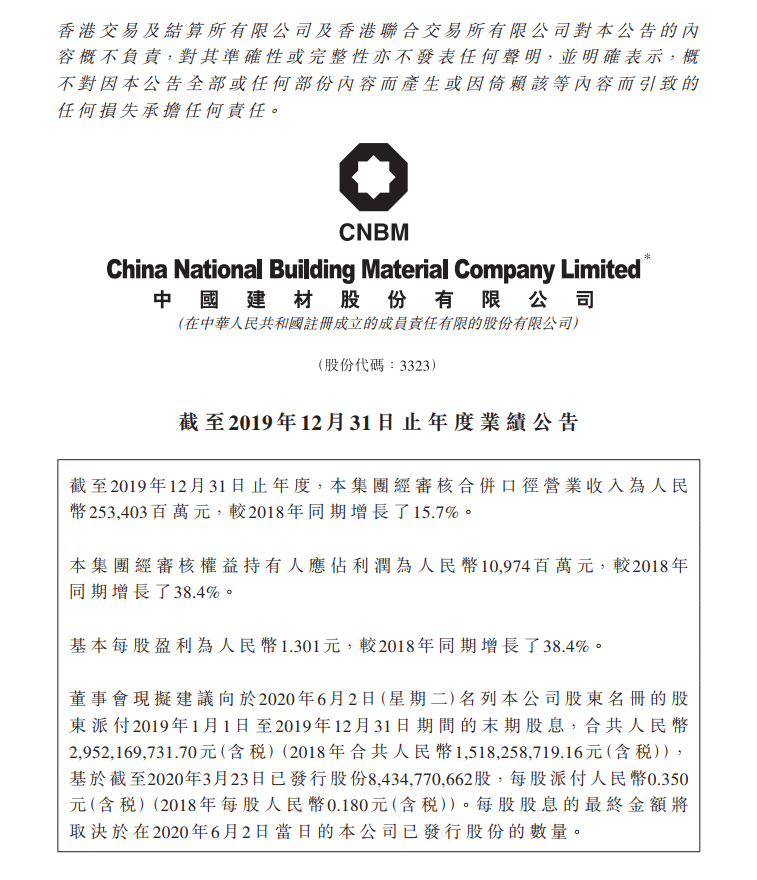 中國建材(03323)公布,截至去年12月31日止年度純利按年升38.4%,至約109.74億元(人民幣。下同),每股盈利1.301元,派末期股息每股35分。