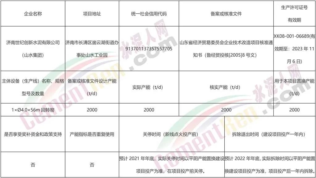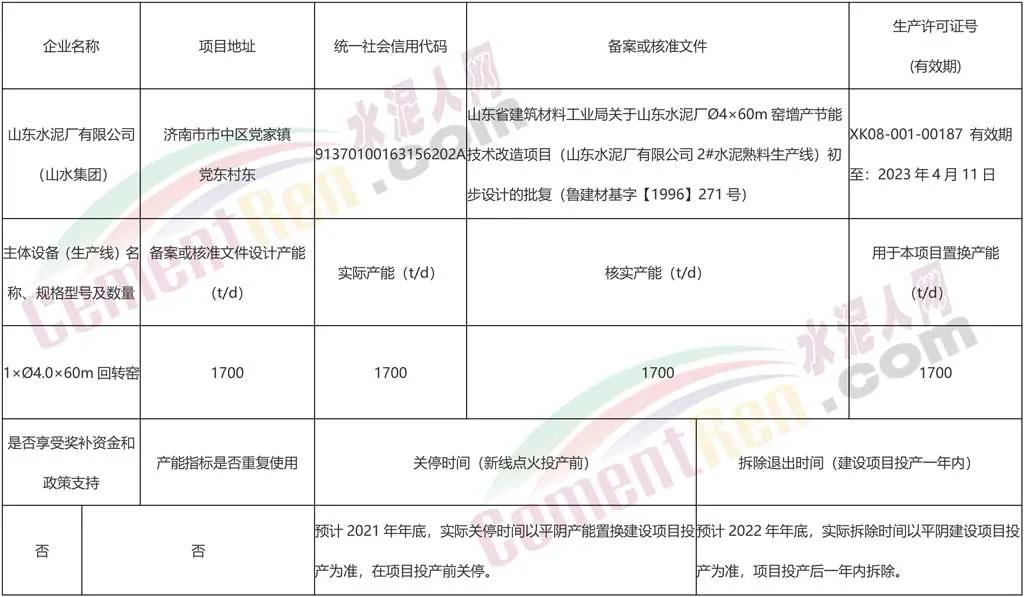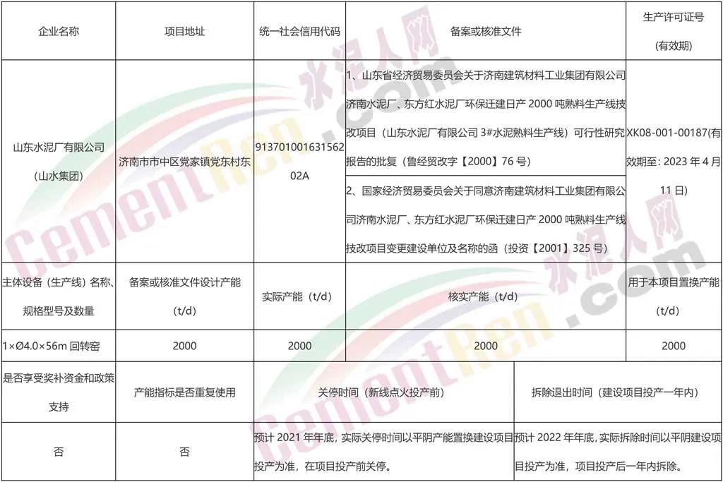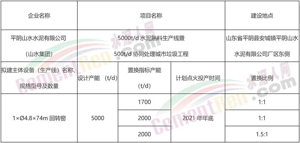 《濟南市平陰山水水泥有限公司產能置換方案公示》顯示,濟南市平陰山水水泥有限公司通過淘汰山水集團旗下三條水泥生產線新建5000t/d水泥熟料生產線 。新建生產線將于2021年年底前點火投產。