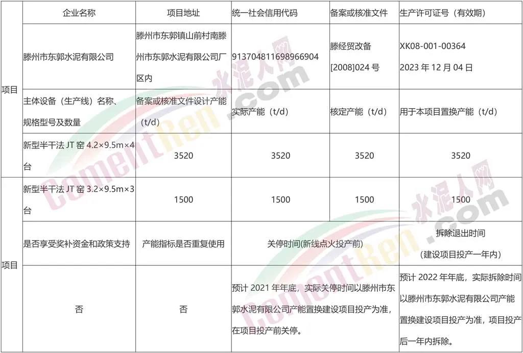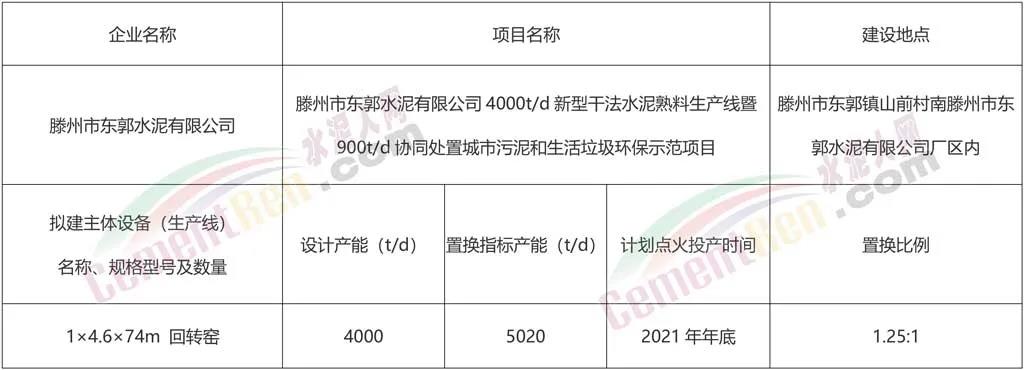 《棗莊市滕州東郭水泥有限公司產能置換方案公示》顯示,滕州市東郭水泥有限公司將通過退出7臺新型半干法JT窯4.2×9.5m4 臺和3.2×9.5m3臺,在公司廠區內新建4000t/d新型干法水泥熟料生產線暨900t/d協同處置城市污泥和生活垃圾環保示范項目,并計劃于2021年年底點火投產。