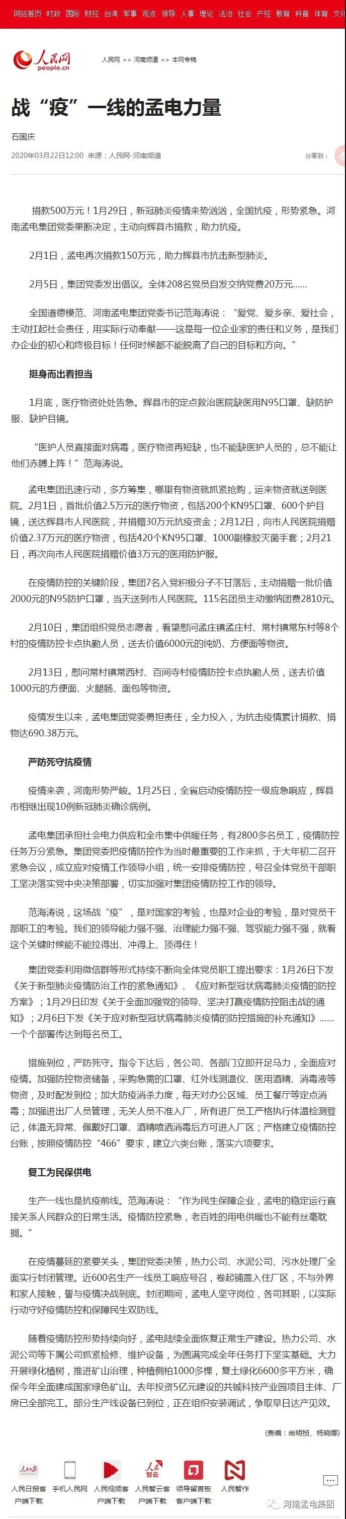 (3月22日,人民網記者撰文對孟電集團面對疫情、主動作為的事跡進行了報道。)